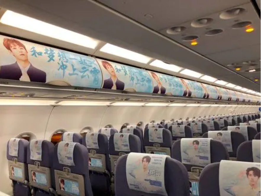 飞机内部广告形式有座椅背贴、小桌板、头枕、行李架